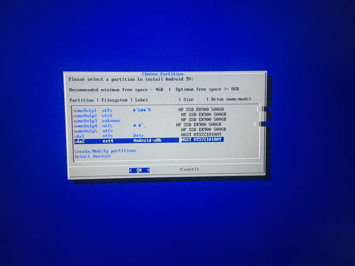 步骤6:选择Android TV x86需要安装的硬盘(硬盘提前分区)